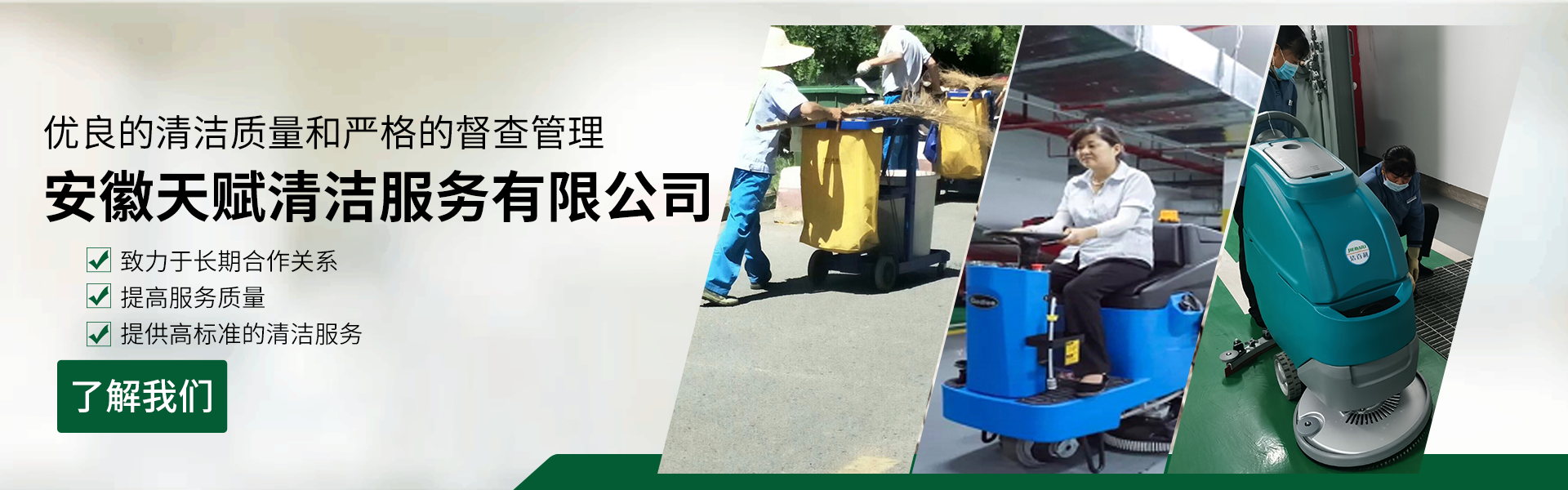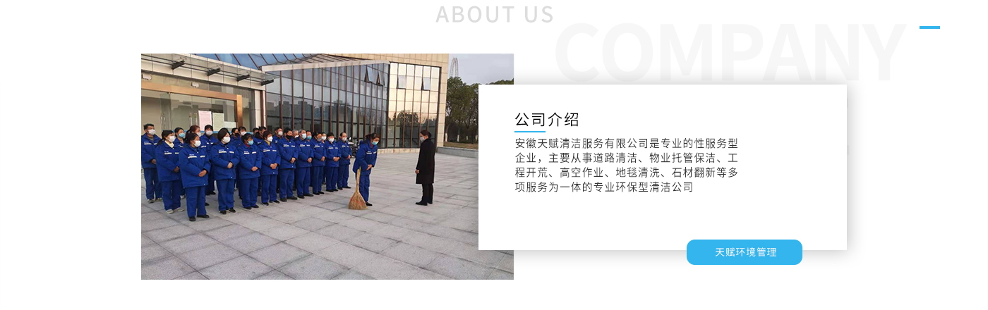 安徽天賦清潔服務(wù)有限公司是的服務(wù)型企業(yè),主要從事道路清潔、物業(yè)托管保潔、工程開荒、高空作業(yè)、地毯清洗、石材翻新等多項服務(wù)為一體的環(huán)保型清潔公司。公司管理機(jī)制完善,清潔作業(yè)經(jīng)驗豐富,擁有技術(shù)力量,嚴(yán)格實行崗前培訓(xùn)—崗中督查—上崗在培訓(xùn)的員工管理措施,憑著優(yōu)良的清潔質(zhì)量和嚴(yán)格的督查管理,為眾多企事業(yè)單位、醫(yī)院、酒店、廠區(qū)商場、物業(yè)、道路、學(xué)校、公園等提供后勤清潔服務(wù)。在業(yè)內(nèi)擁有良好的口碑。工作人員,服務(wù)態(tài)度優(yōu),竭力為客戶提供好的保潔服務(wù)。安徽天賦清潔服務(wù)有限公司:致力于長期合作關(guān)系,提高服務(wù)質(zhì)量,提供高標(biāo)準(zhǔn)的清潔服務(wù)。公司的經(jīng)營理念:為營造一個更清潔、亮麗的生活和工作環(huán)境而努力!“誠信”是公司成功保證。“客戶至上,信譽(yù)為首”是公司宗旨。高標(biāo)準(zhǔn)提供服務(wù),維護(hù)客戶利益、形象,是我始終不渝的目標(biāo)。